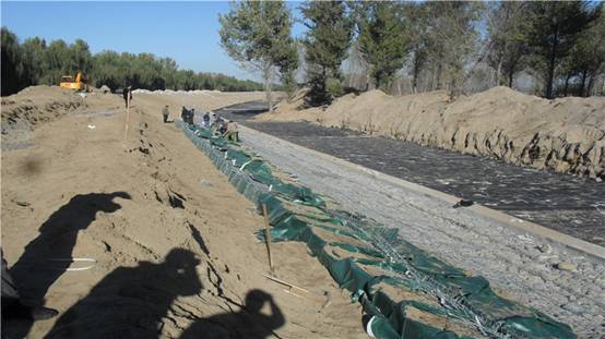 左堤加高:樁號(hào)ZD6+918~ZD9+235,填筑質(zhì)量標(biāo)準(zhǔn):粘性土壓實(shí)度≥92%,無粘性土相對(duì)密度≥0.65。填筑完成后進(jìn)行麻網(wǎng)椰纖植生毯鋪設(shè)。