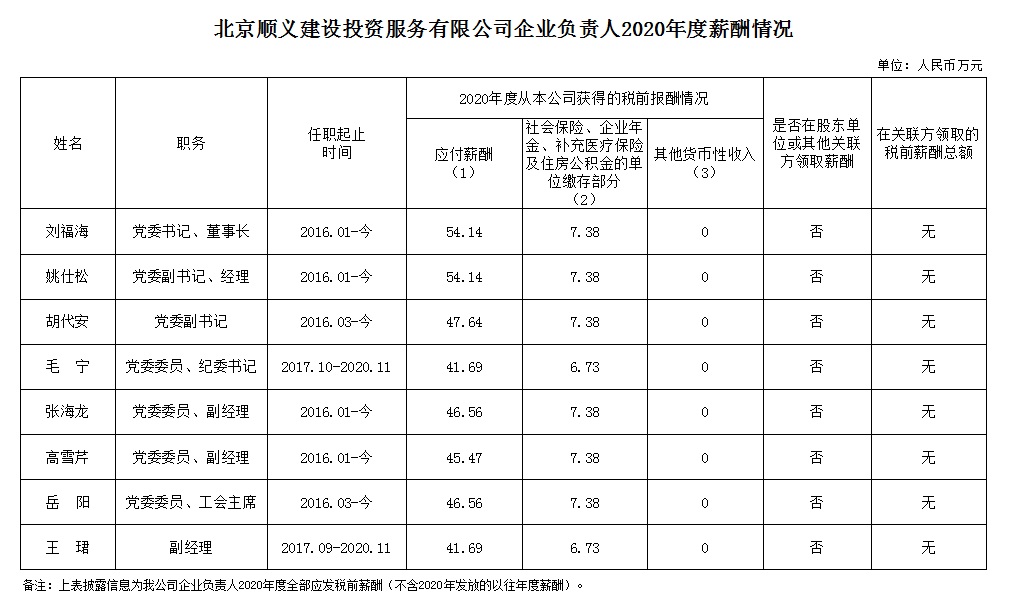 北京順義建設(shè)投資服務(wù)有限公司企業(yè)負(fù)責(zé)人2020年度薪酬信息披露